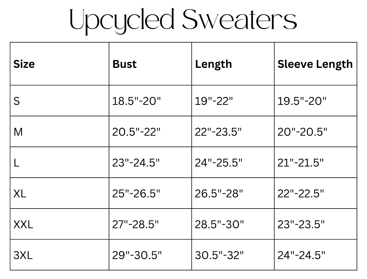 All of our sweaters are thrifted and upcycled, making each piece one of a kind.
